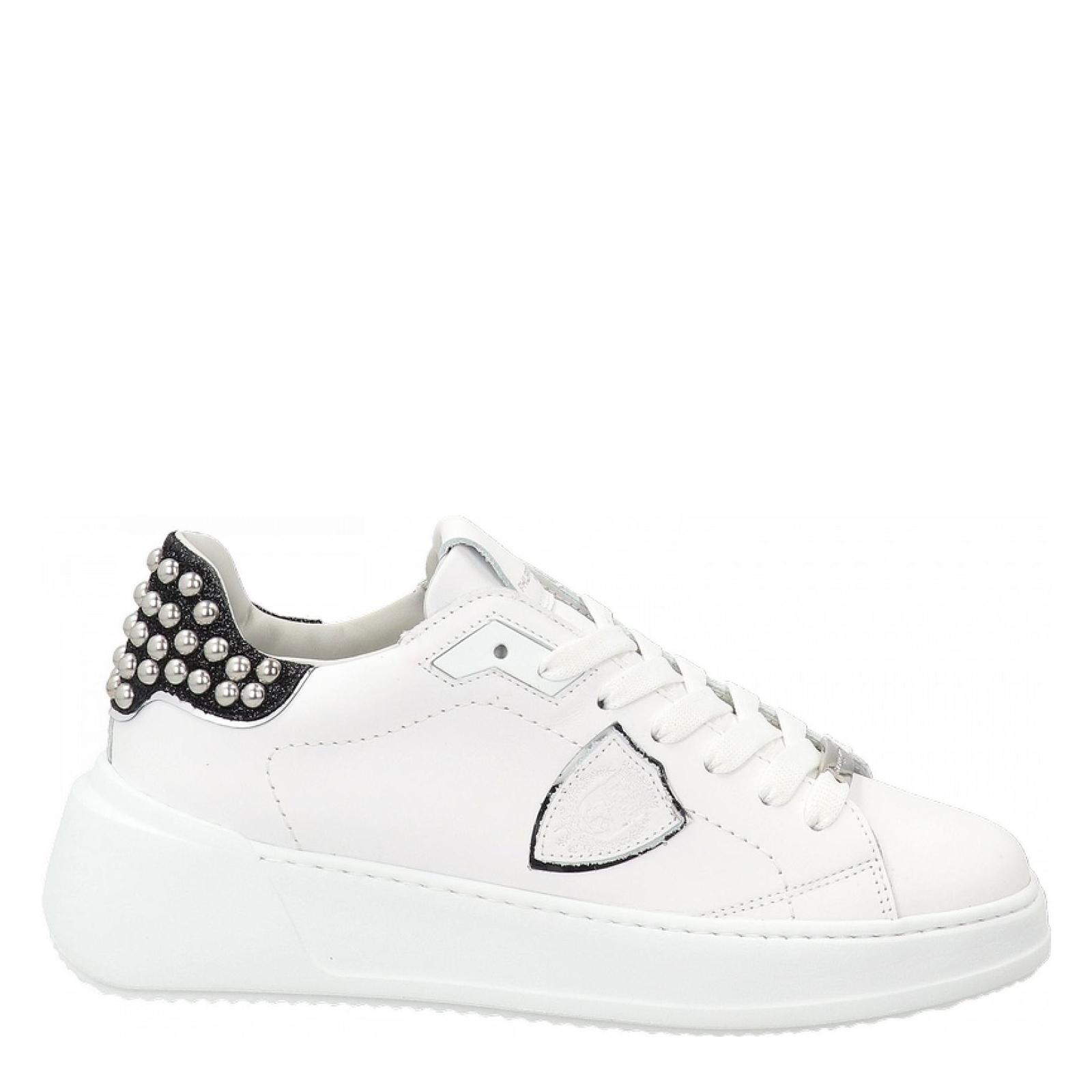Linee essenziali e volumi puliti definiscono questa nuova interpretazione della sneaker Tres Temple. La tomaia in vitello candido è decorata da un topponcino in glitter nero impreziosito da borchie tonde, completato da bordo argentato. Fodera in spugna di cotone e soletta interna in pelle estraibile. Perfette ogni giorno, slanciano la figura grazie alla suola bold in gomma ultra leggera con altezza 4 cm e bordo sagomato.