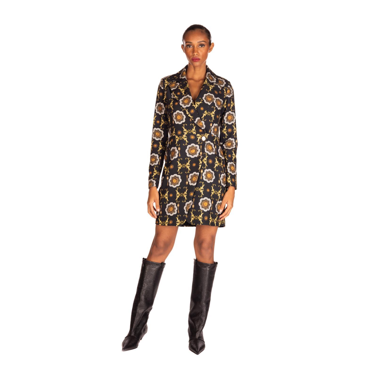 Robe manteau foderato, con collo reverse in tessuto a fantasia leggermente sfiancato. Chiusura a un bottone.