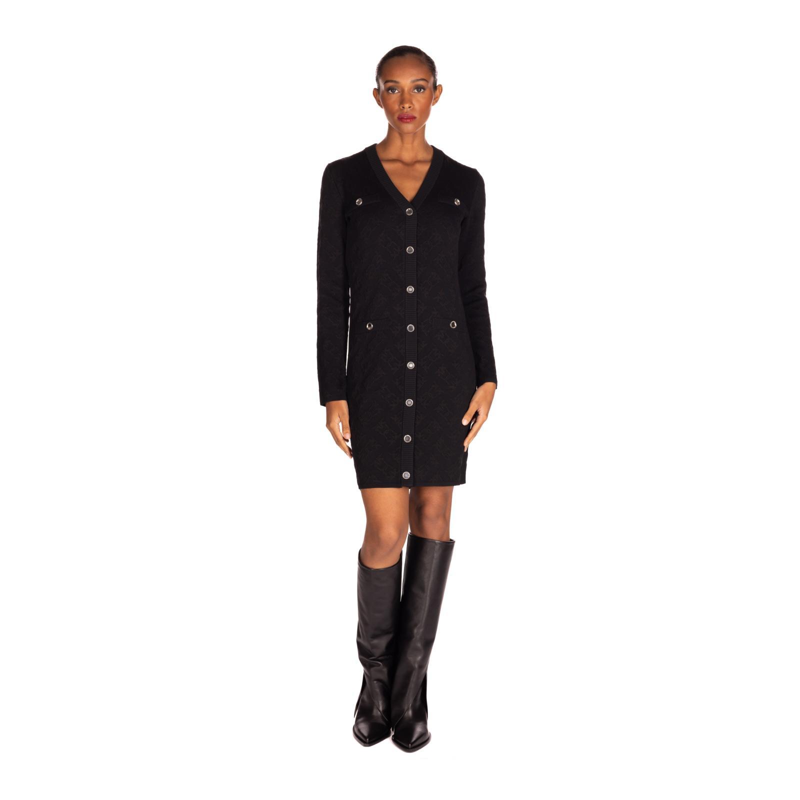 Abito corto dalla linea a cardigan in maglia di viscosa tecnica jacquard con disegno logo uccellini Love Birds Monogram realizzato leggermente in rilievo. La linea aderente dell'abito è completata da profondo scollo a V, maniche lunghe e doppia coppia di taschini a filetto con bottone applicato davanti. I profili dell'abito in maglia sono rifiniti con lavorazione a costine. L'abbottonatura femminile dell'abito consente anche di creare un mini spacco al fondo aprendo uno o due bottoni.