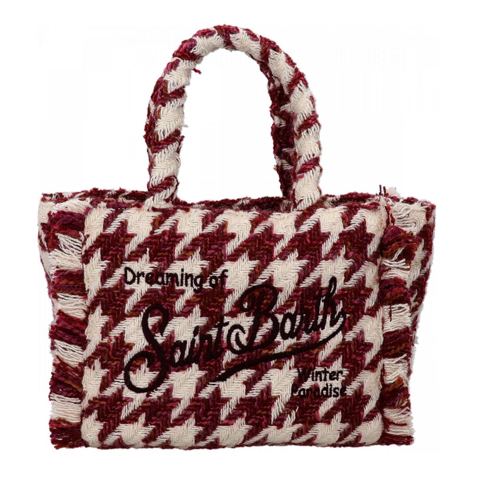 Questa variante pied de poule con frange ai lati, logo ricamato e tracolla removibile misura 27 x 25 x 15 cm.