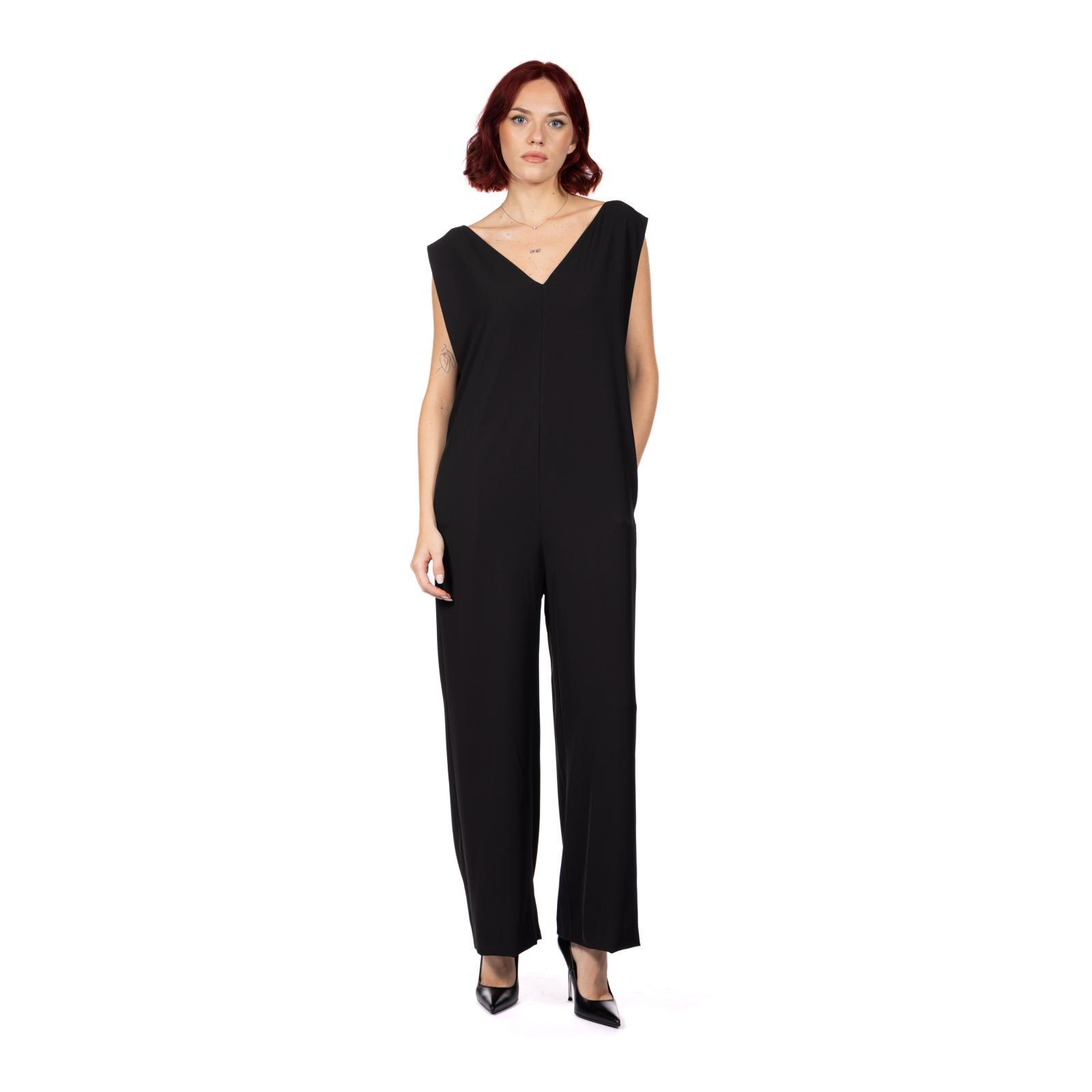 Tuta smanicata dal fit over e dalla linea dritta, con scollo a V sul davanti e apertura a goccia con chiusura con nastrino sul retro e tasche laterali.
