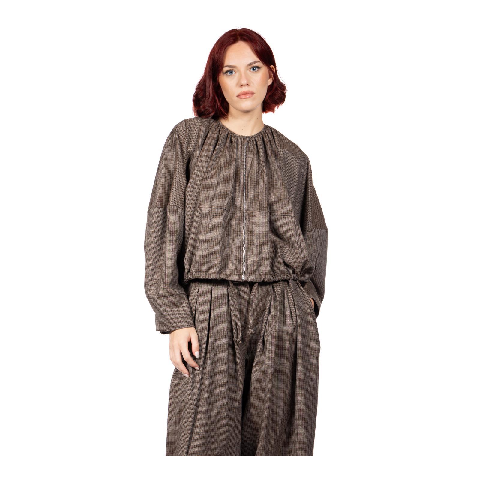 Giacca boxy bomber in tessuto check, con scollo rotondo e coulisse sul fondo che permette una abbondante arricciatura. Chiusura con zip in metallo, manica scesa con polsino alto.