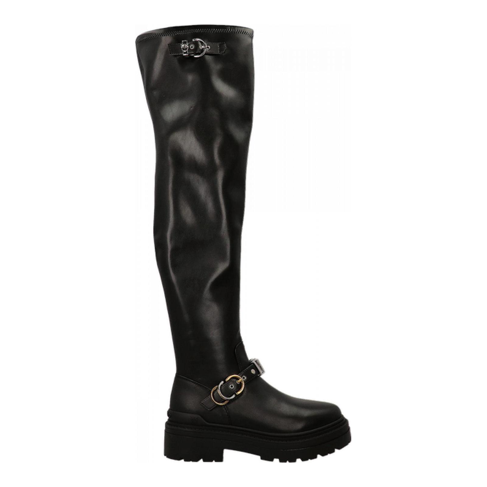 Stivali in pelle over-the-knee con gambale alto 58 cm e suola in gomma alta 5,5 cm. Questo modello in nappa stretch è arricchito da dettagli metallici che ne accentuano la personalità. La zip laterale ne facilita la calzata, mentre i cinturini regolabili con fibbia, di cui uno dotato di passante metallico con logo Love Birds, aggiungono un tocco rock e sofisticato.