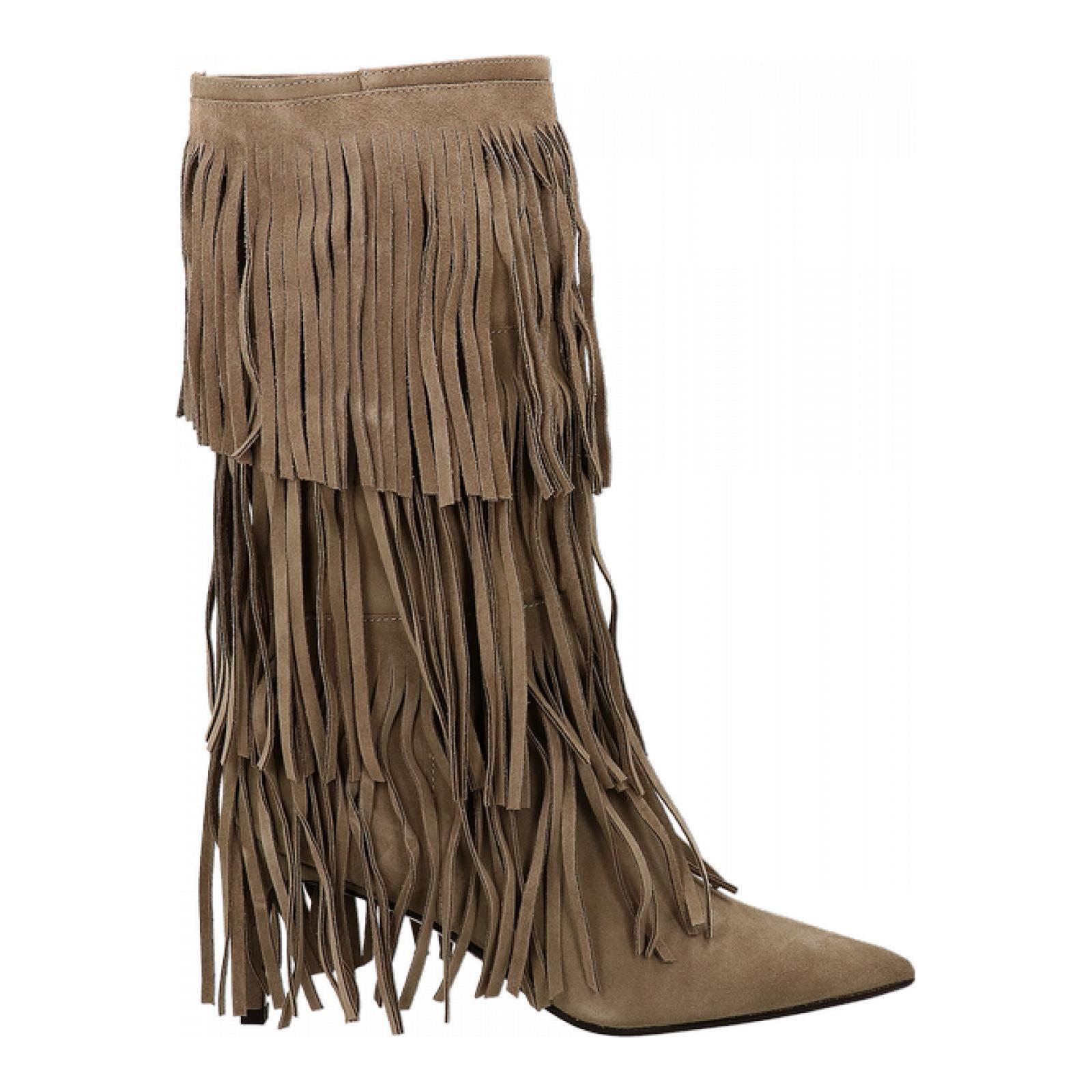 Stivale tubolare a mezzo polpaccio realizzato in camoscio con frange decorative. Punta sfilata e tacco a stiletto alto 8 cm. Fondo in cuoio con mezza gomma antiscivolo.