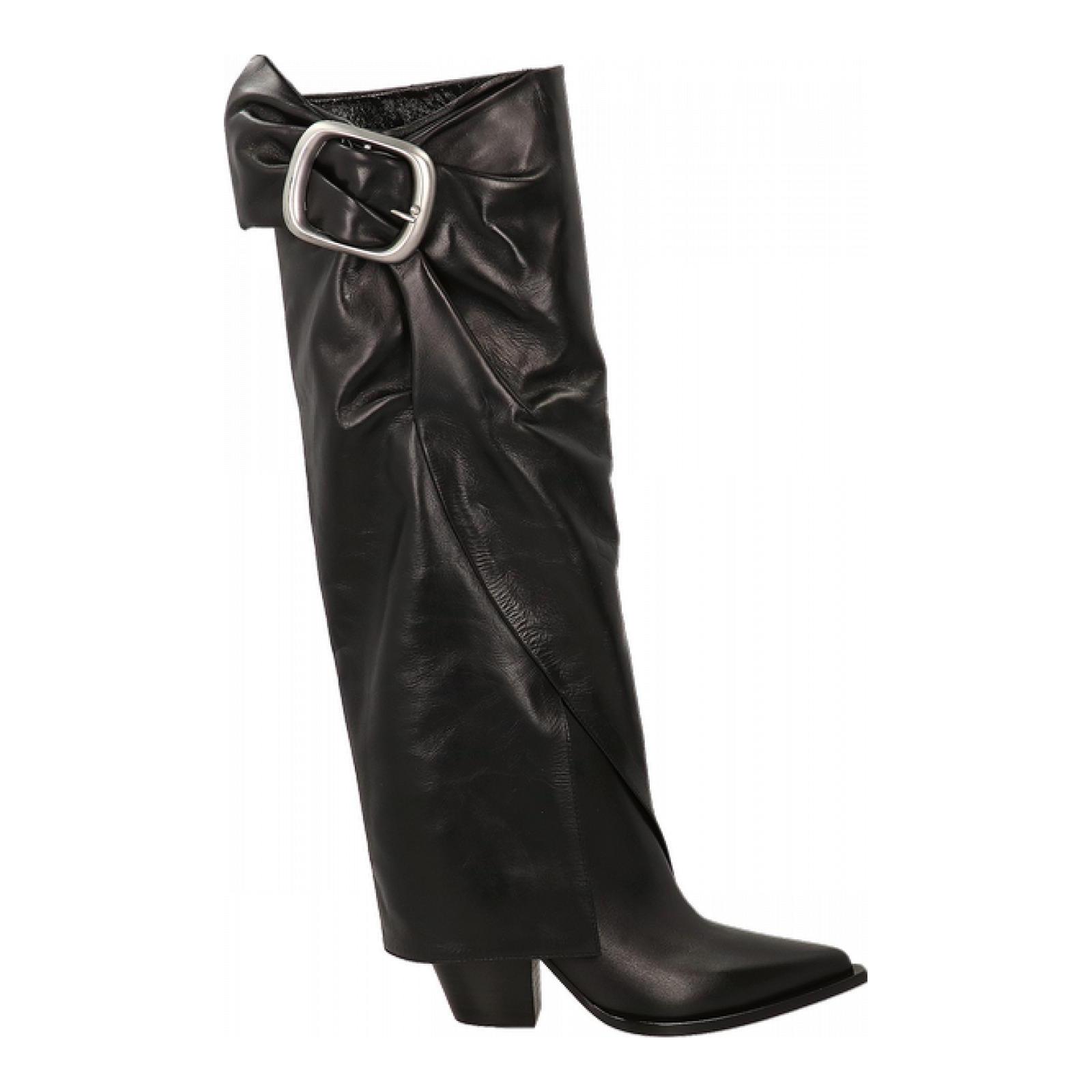 Vai al carrelloStivale alto in pelle nera, dal profilo elegante e d'impatto. Il morbido gambale rovesciato e la fibbia in metallo valorizzano il pellame liscio, aggiungendo personalità decisa a un design ricercato. Il tacco slanciato da 7 cm e la suola in cuoio garantiscono un'eleganza raffinata e un passo sicuro. Un modello di tendenza, perfetto per completare look sofisticati o grintosi con un tocco di lusso distintivo.
