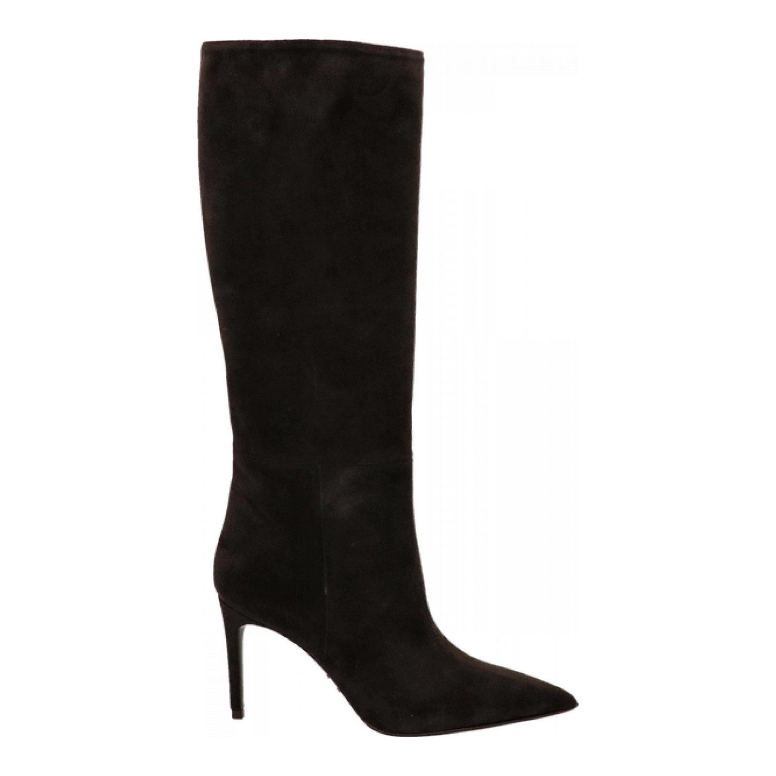 Elegante stivale tubolare realizzato in camoscio testa di moro. Punta sfilata e tacco a stiletto alto 8.5 cm. Fodera interna in pelle e fondo in cuoio con mezza gomma antiscivolo. Made in Italy.