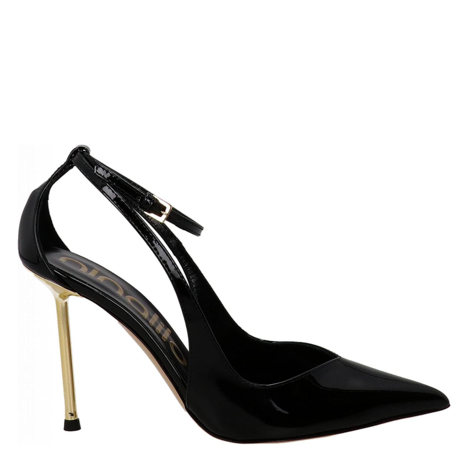 Elegante scarpa realizzata in pelle verniciata con punta sfilata e scollo a V. Tallone chiuso con cinturino regolabile alla caviglia. Fodera in pelle, suola in cuoio con tacco a stiletto metallizzato alto 10 cm. Made in Italy.