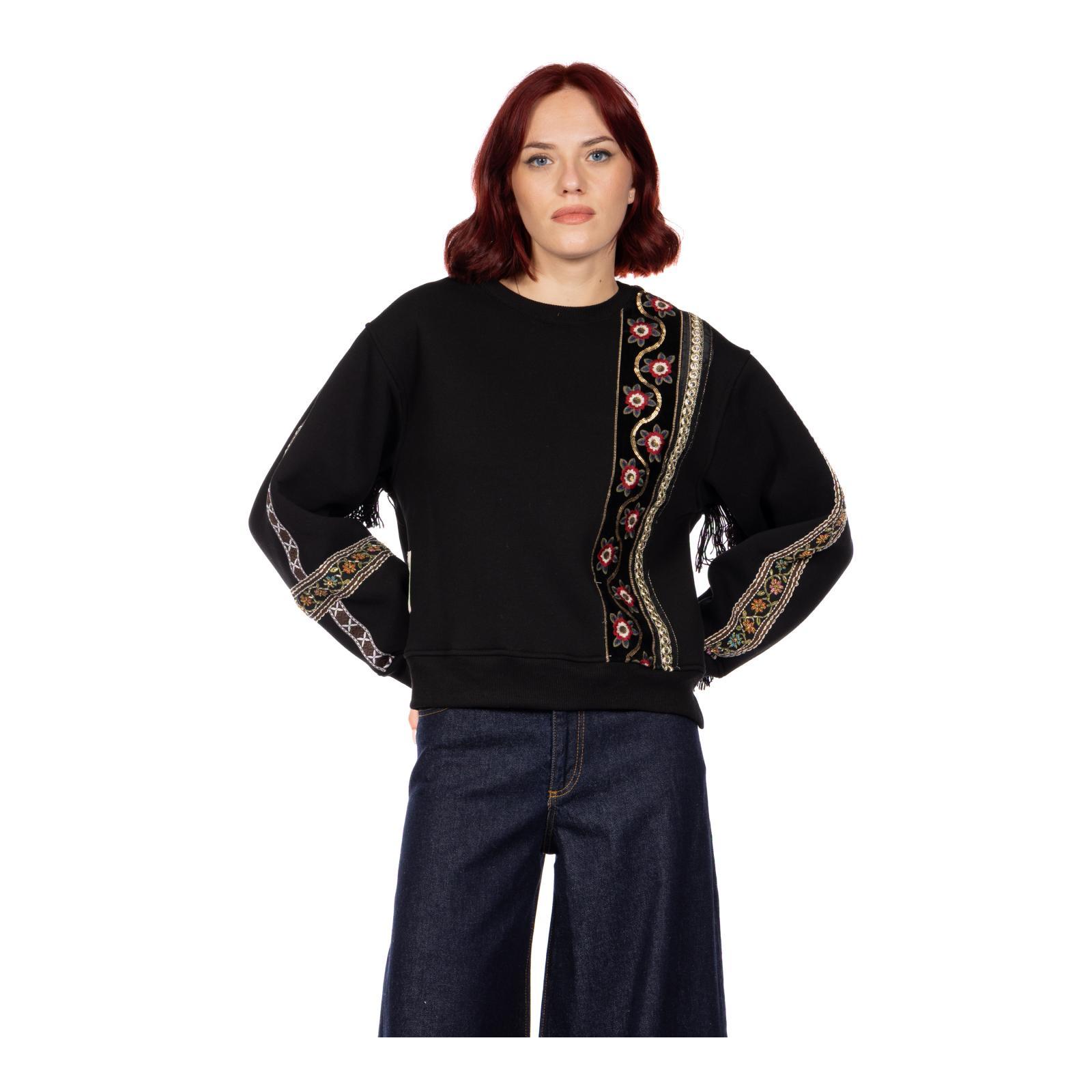 Felpa girocollo a maniche lunghe con dettaglio di ricami, passamaneria e frange decorative.