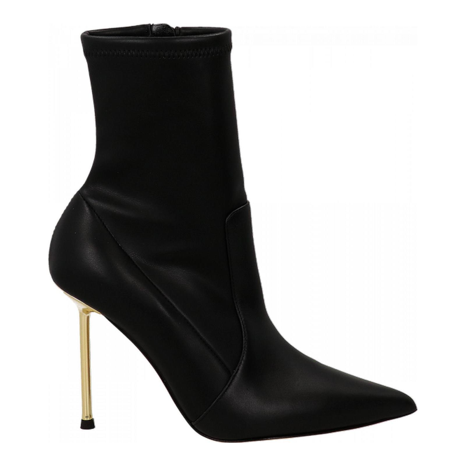 Elegante stivaletto dalla linea sfilata realizzato in nappa stretch, gambale elasticizzato con zip interna per una calzata agevolta. Fodera in tessuto, suola in cuoio. Tacco a stiletto metallizzato oro alto 10 cm. Made in Italy.
