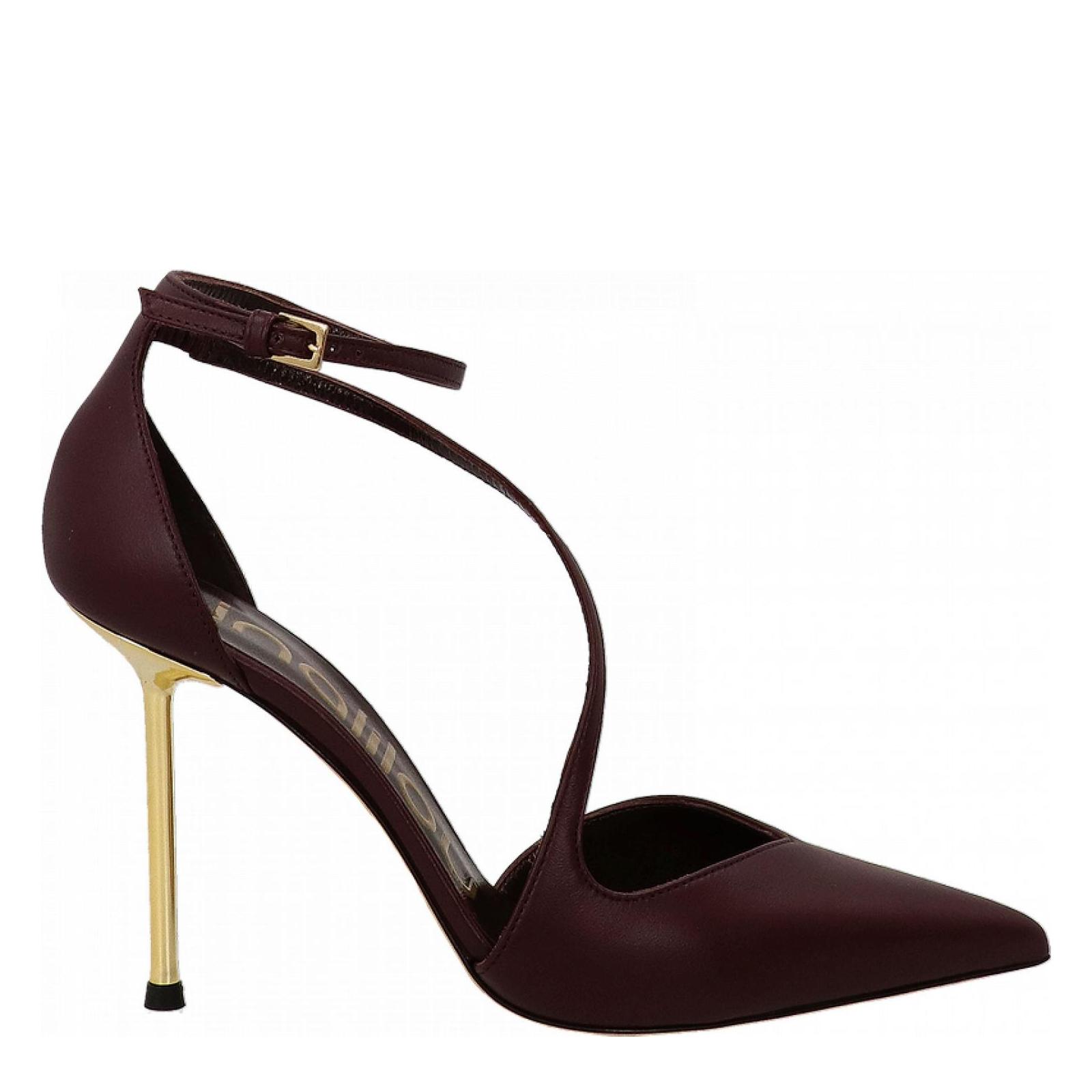 Elegante scarpa realizzata in pelle con punta sfilata e scollo a V. Tallone chiuso con cinturino regolabile sul collo del piede. Fodera in pelle, suola in cuoio con tacco a stiletto metallizzato alto 10 cm. Made in Italy.