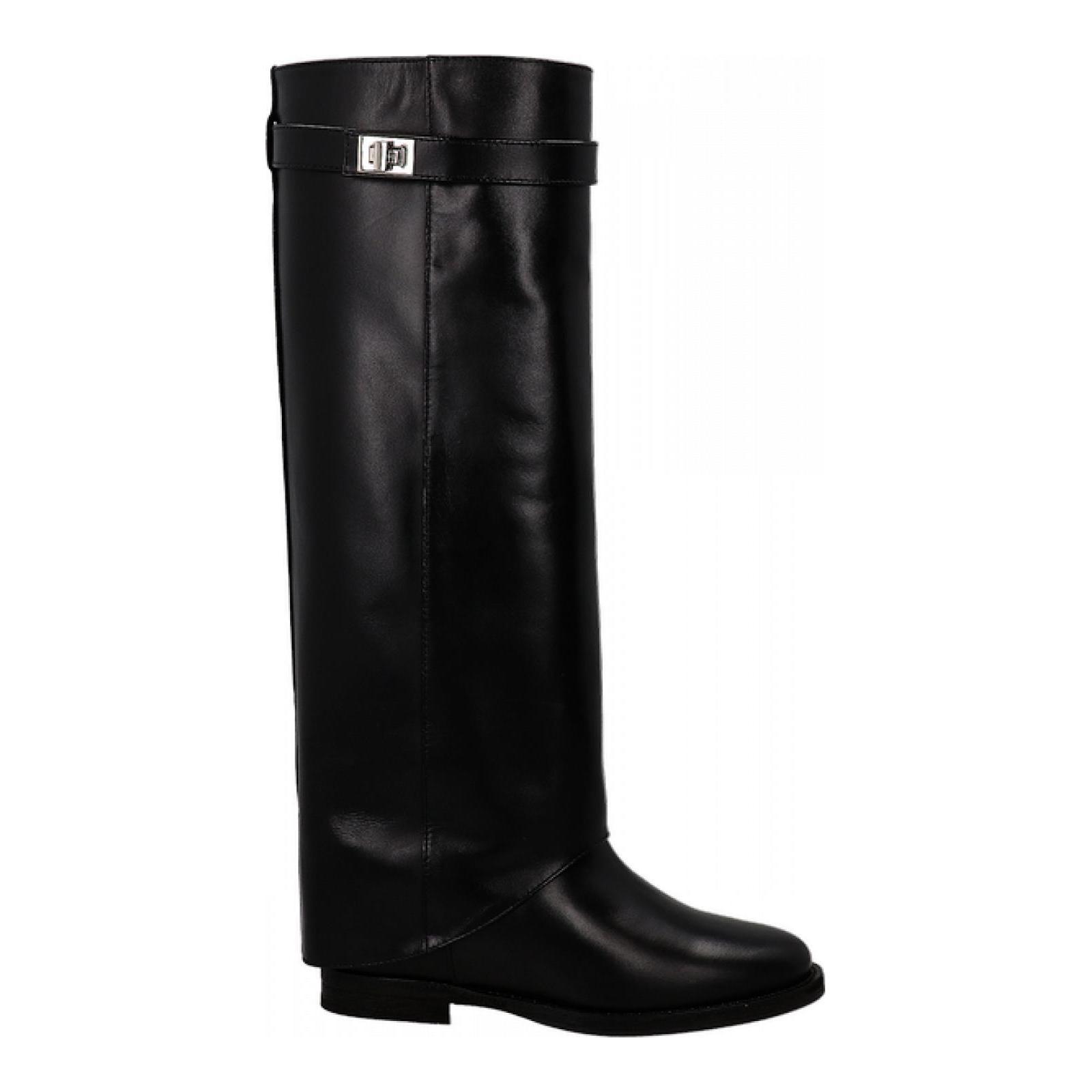 Stivale tubolare in pelle con doppio gambale e cinturino decorativo con gangio metallico. Fodera interna in pelle. Suola in cuoio e gomma. Rialzo interno di 5,5 cm e tacco di 2 cm. Realizzati interamente in Italia.