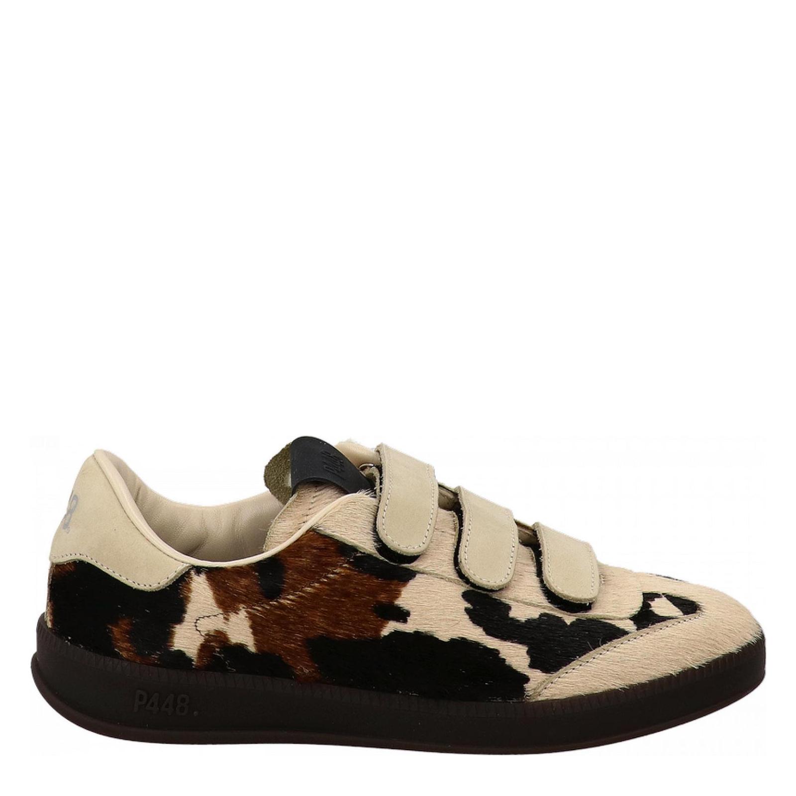 La Capri Leopard/Camel è un'elegante sneaker con stampa animalier. Questa scarpa bassa senza tempo è rivestita in cavallino a stampa animalier marrone e beige. La chiusura è con tre cinturini con velcro in pelle di nabuk beige, pelle ripresa nel talloncino logato. Le suole in gomma marrone scuro P448 completano il look.