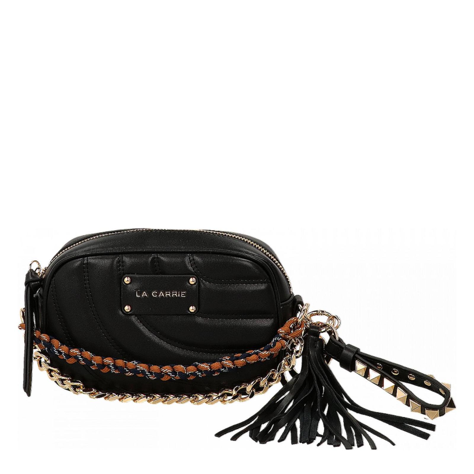 Borsetta/marsupio ovale in pelle con impuntura. Tracolla di catena e cintura intercambiabili in dotazione. Catena con scoobydoo in tessuto decorativa e removibile.