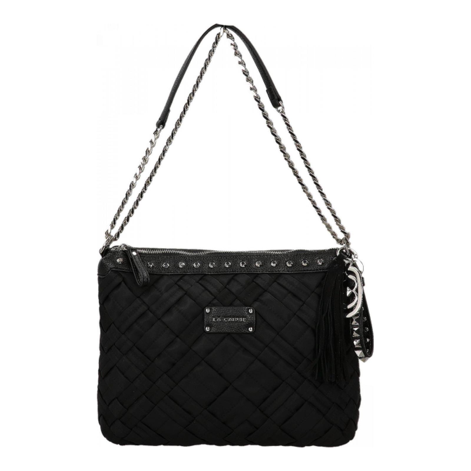 Borsa realizzata in tessuto di nylon con lavorazione ad intreccio e decorata con borchiette in metallo. Tracolla in catena regolabile a doppia portabilità. Unico comparto chiuso da zip.