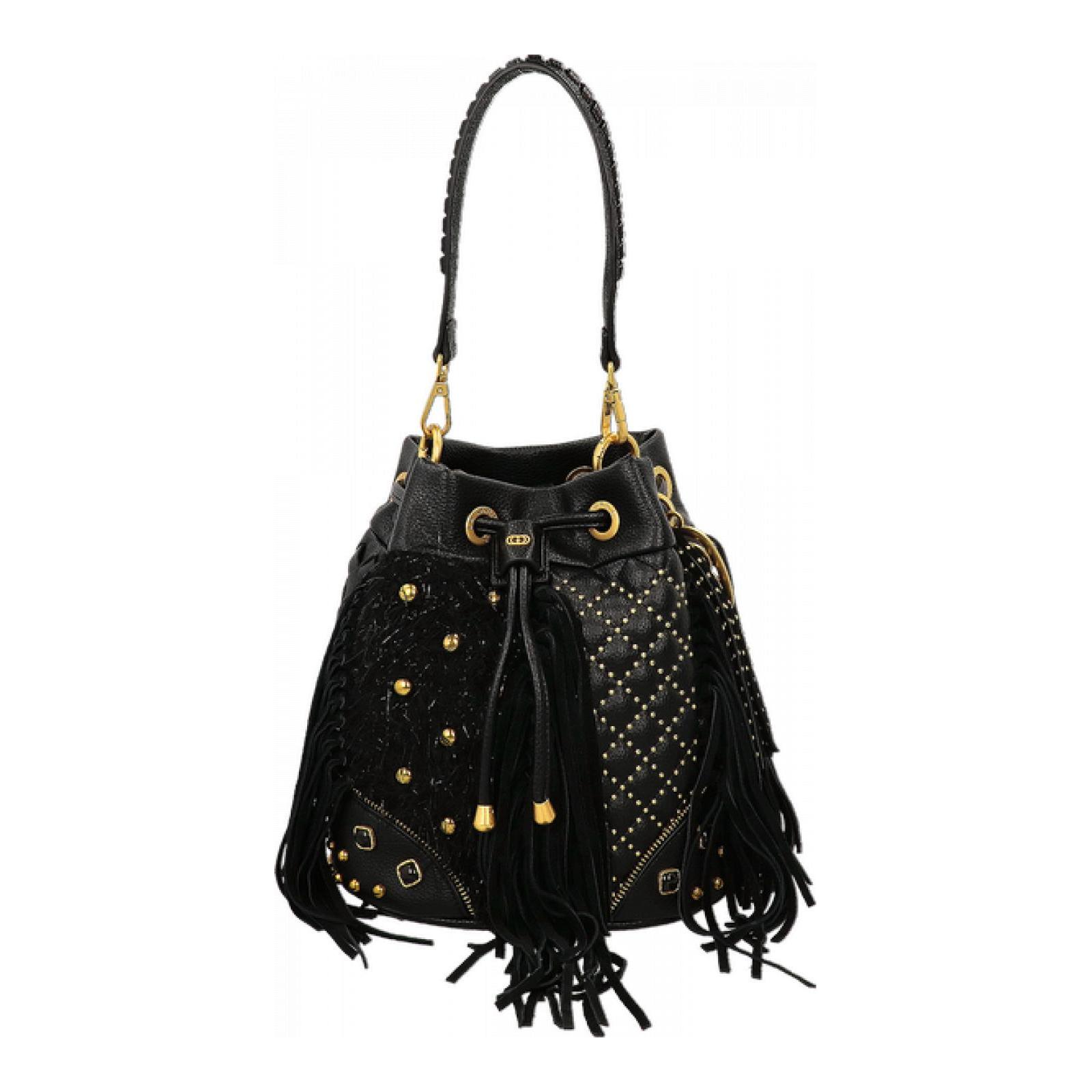 Borsa a secchiello realizzata in ecopelle e tessuto bouclè decorata con borchie e pietre smaltate. Inserti di frange in suede, infilature e cerniera decorativa sul fondo. Chiusura con coulisse e calamita. Dotata di due tracolle intercambiabili, una in ecopelle con infilatura con portabilità a spalla, ed una lunga in ecopelle con inserto di catena in metallo dorato per una portabilità a cross body. Unico comparto interno con taschini di cui uno chiuso da zip. Charms removibile con nappina e logo. Piedini prottetivi in metallo sul fondo.